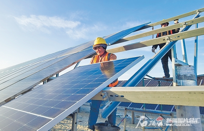 12月1日,位于和田市吉亞鄉(xiāng)的華潤(rùn)新能源50萬(wàn)千瓦光伏治沙項(xiàng)目施工現(xiàn)場(chǎng)一派熱火朝天景象。該項(xiàng)目總投資約15億元,預(yù)計(jì)明年5月底實(shí)現(xiàn)全容量投產(chǎn)。圖為工人在鋪設(shè)光伏板。 石榴云/新疆日?qǐng)?bào)記者 湯永攝
