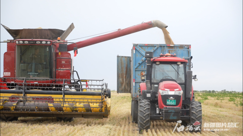 6月5日,喀什地區(qū)麥蓋提縣新疆五征綠色農(nóng)業(yè)發(fā)展有限公司在塔克拉瑪干沙漠邊緣種植的6000余畝冬小麥?zhǔn)斋@場(chǎng)景(資料圖)。買熱古·買買提攝