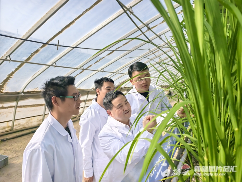 11月20日,和田地區(qū)和田縣萬(wàn)畝設(shè)施農(nóng)業(yè)基地沙漠溫室水稻種植大棚內(nèi),中國(guó)農(nóng)業(yè)科學(xué)院都市農(nóng)業(yè)研究所首席科學(xué)家楊其長(zhǎng)團(tuán)隊(duì)正在查看水稻長(zhǎng)勢(shì)。胡禮政攝