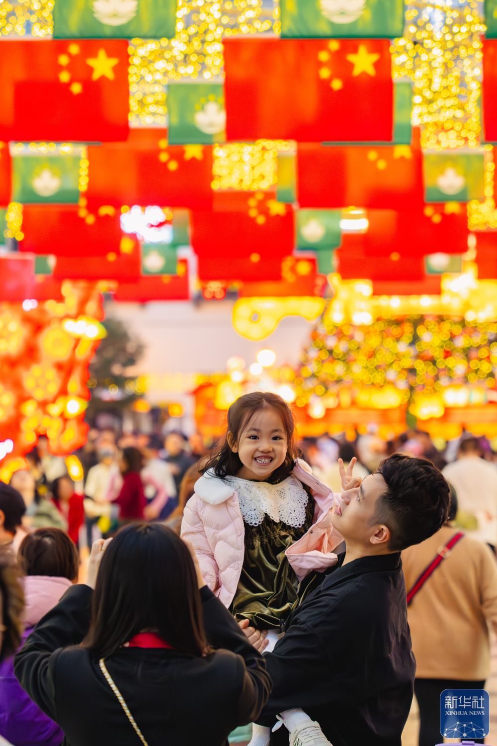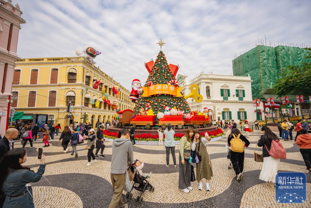 12月12日,游客在澳門(mén)議事亭前地的圣誕樹(shù)前拍照。