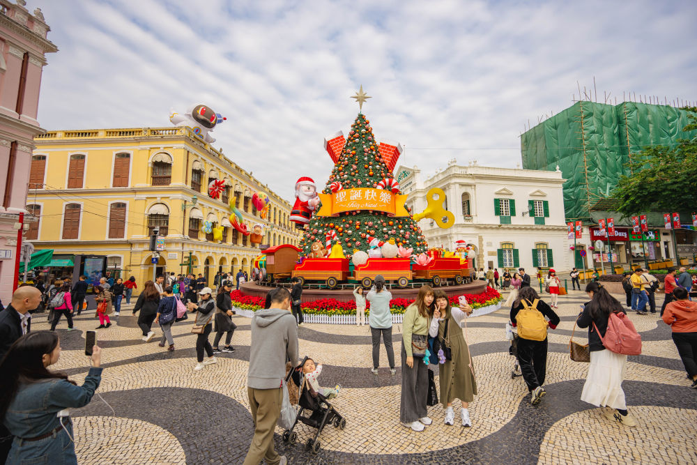 12月12日,游客在澳門(mén)議事亭前地的圣誕樹(shù)前拍照。新華社記者 朱煒 攝