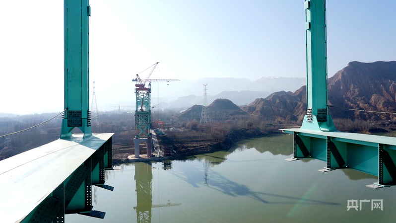 圖為12月20日拍攝的尖扎黃河特大橋施工現(xiàn)場(央廣網(wǎng)記者 汪曉青 攝)