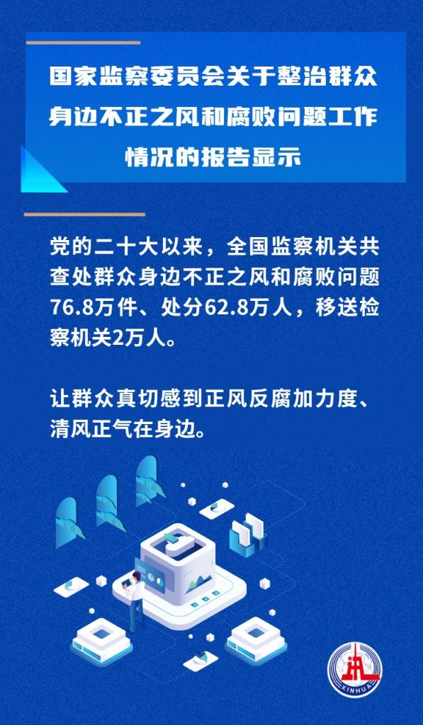黨的二十大以來,全國監(jiān)察機(jī)關(guān)查處群眾身邊不正之風(fēng)和腐敗問題76.8萬件、處分62.8萬人,移送檢察機(jī)關(guān)2萬人……