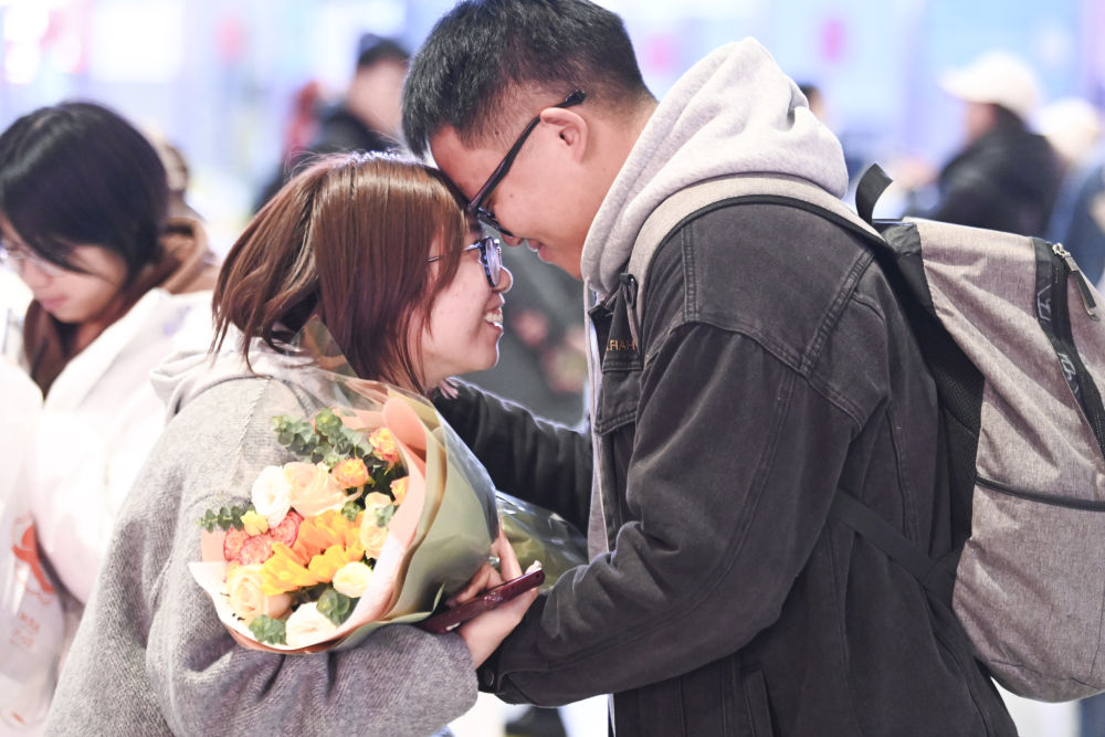 2月5日,在廣西柳州站出站口,一名接站者與剛出站的女朋友碰頭互動(dòng)。