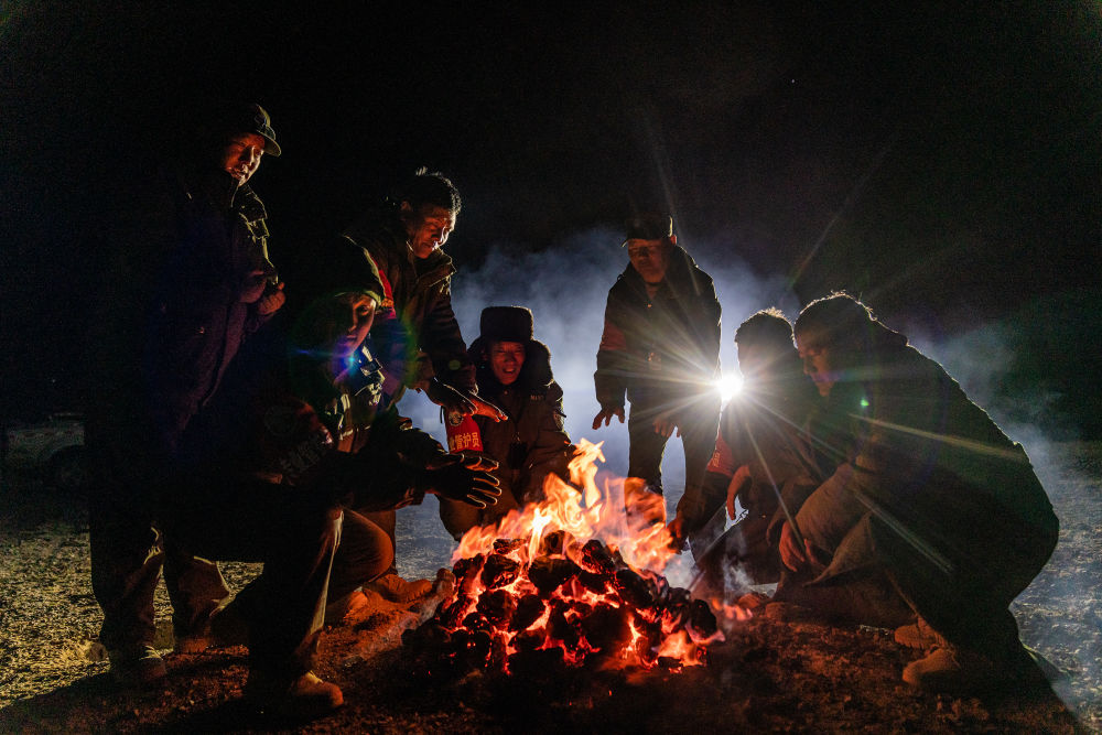 2024年5月10日,在羌塘國(guó)家級(jí)自然保護(hù)區(qū)核心區(qū)域,野生動(dòng)物專業(yè)管護(hù)隊(duì)員在宿營(yíng)地里烤火,燃料是野牦牛的糞便。羌塘國(guó)家級(jí)自然保護(hù)區(qū)位于西藏自治區(qū)北部,這里的管護(hù)隊(duì)員常年頂風(fēng)冒雪,穿越無(wú)人區(qū)進(jìn)行巡護(hù)。