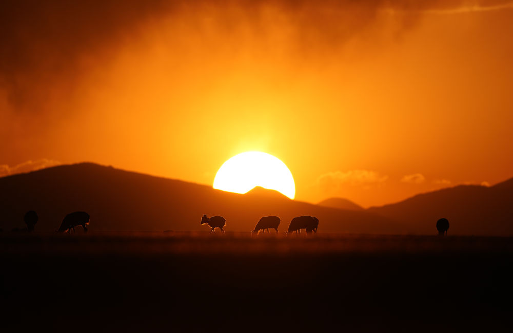 這是2024年6月16日拍攝的晚霞中魯確塘草原上待產(chǎn)的國(guó)家一級(jí)保護(hù)動(dòng)物藏羚羊。