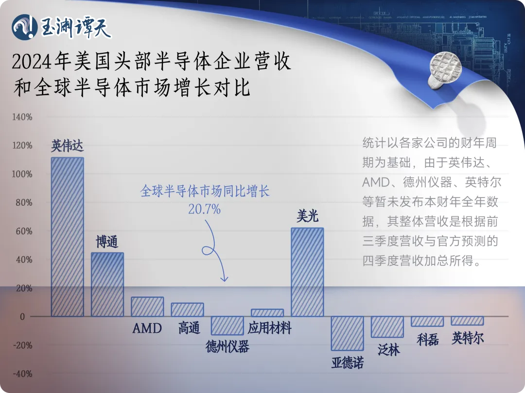 2024年,全球芯片市場都在回暖,預(yù)計同比增長20.7%。與此同時,英偉達(dá)2024年營收預(yù)計同比增長超100%,成為美國芯片市場增長最大的動力。