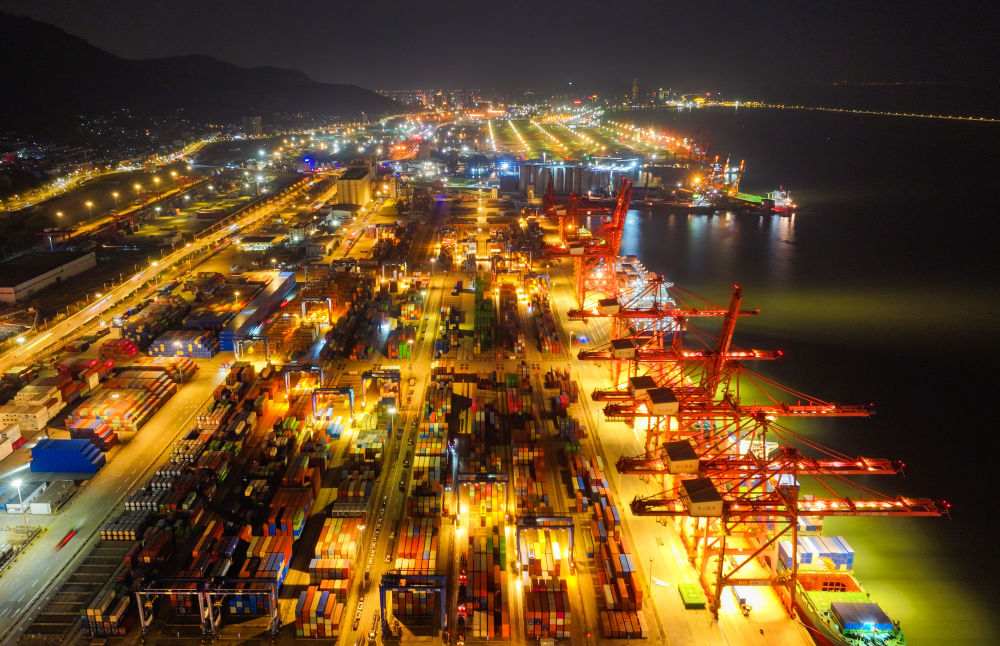 當(dāng)日,夜幕下的江蘇連云港港集裝箱碼頭燈火明亮,工作人員繁忙有序地進行裝卸工作。臨近年末,江蘇連云港港持續(xù)提升港口集疏運水平,多措并舉加快貨物裝卸轉(zhuǎn)運效率,力爭外貿(mào)集裝箱吞吐量與出口量再創(chuàng)新高。