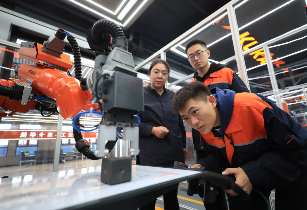 產(chǎn)教融合促就業(yè)。11月22日,沈陽工學(xué)院電氣工程及自動化專業(yè)學(xué)生操作機器人進行物料碼垛實訓(xùn)。(新華社記者楊青攝)