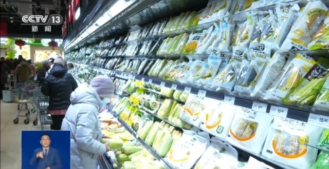 記者在北京一家生鮮超市里看到,新年主題的裝飾品擺放在顯著位置,年貨禮盒琳瑯滿目。新鮮到店的蔬菜、鮮果、肉類等商品排滿了貨架,吸引了大批顧客選購(gòu)。