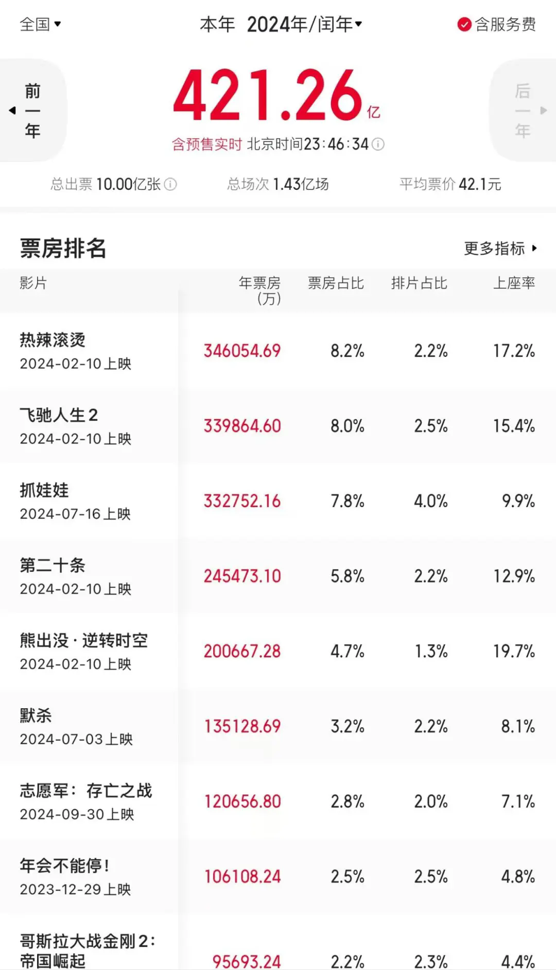 總場(chǎng)次1.43億場(chǎng),平均票價(jià)42.1元