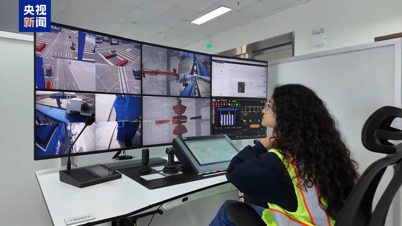 在遠(yuǎn)程操作區(qū),我們看到,通過電腦控制系統(tǒng)即可實現(xiàn)港口裝卸的全自動化操作。員工無需再攀上高高的吊機,只需坐在控制臺前,通過多角度實時監(jiān)控屏和搖桿手柄,便能精確完成數(shù)百噸甚至上千噸集裝箱的裝卸任務(wù)。