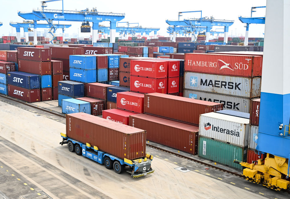 2024年10月20日,在廣西北部灣港欽州港區(qū)碼頭,一輛自動化無人轉(zhuǎn)運(yùn)車在運(yùn)送集裝箱。各式各樣運(yùn)往東盟各國的貨物在這個海鐵聯(lián)運(yùn)自動化集裝箱碼頭實現(xiàn)“下船即上車、下車即上船”。新華社記者李賀攝