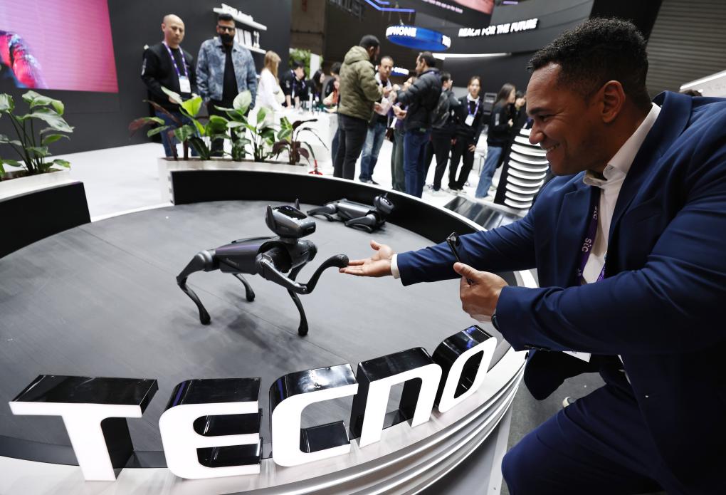 2024年2月26日,在西班牙巴塞羅那舉行的2024年世界移動通信大會上,人們參觀傳音旗下的TECNO展臺。新華社記者高靜攝