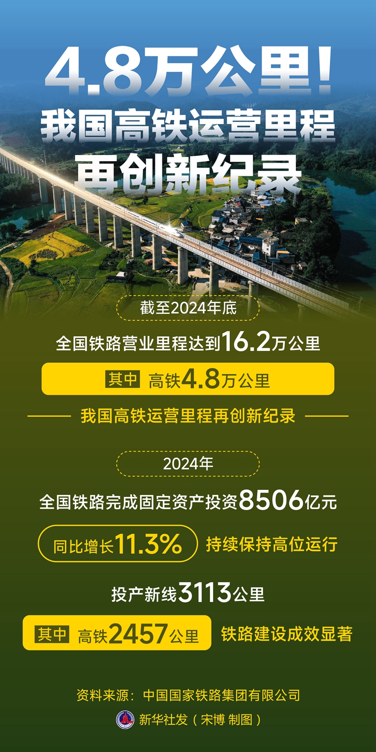 2日,中國國家鐵路集團(tuán)有限公司召開工作會議。會議發(fā)布的最新統(tǒng)計數(shù)據(jù)顯示,截至2024年底,全國鐵路營業(yè)里程達(dá)到16.2萬公里,其中高鐵4.8萬公里,我國高鐵運(yùn)營里程再創(chuàng)新紀(jì)錄。