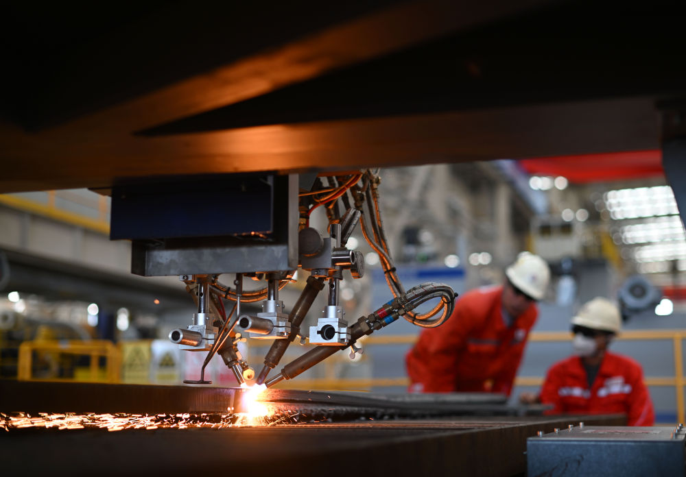 工作人員在海油工程天津智能制造基地制管作業(yè)車間調試數控切板機(2024年10月30日攝)。 新華社記者 趙子碩 攝
