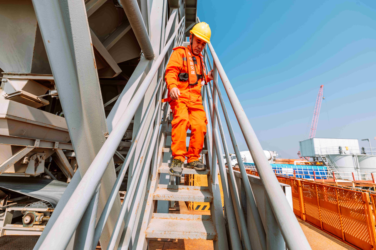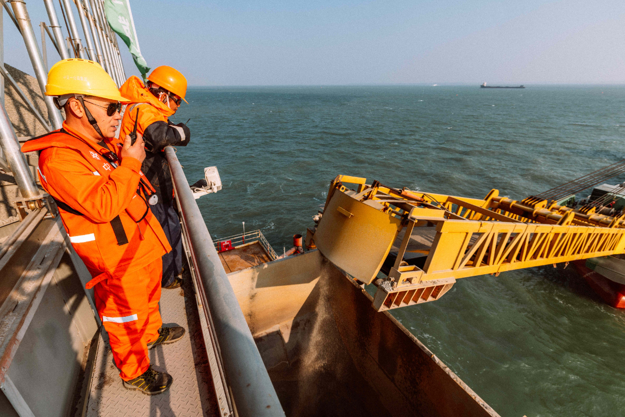 1月17日,夕陽下的廈門劉五店港區(qū),北風(fēng)勁吹。在距離中交一公局集團(tuán)廈金大橋(廈門段)項(xiàng)目海上平臺(tái)混凝土操作員梁芝敬站立位置不到30米的洋面上,一艘船身印有“帆順168”字樣的補(bǔ)料船,裝載著4000多噸砂石緩緩抵近。船頭前方延伸出一條25米長的傳送皮帶,將船上的砂料源源不斷地送抵老梁眼前的鋼制固料斗內(nèi)。當(dāng)天他們要趁著海水退潮帶來的作業(yè)窗口,為站里補(bǔ)上700噸機(jī)制砂和900噸粒徑10到20毫米的小石子,以確保混凝土站生產(chǎn)不停機(jī)。