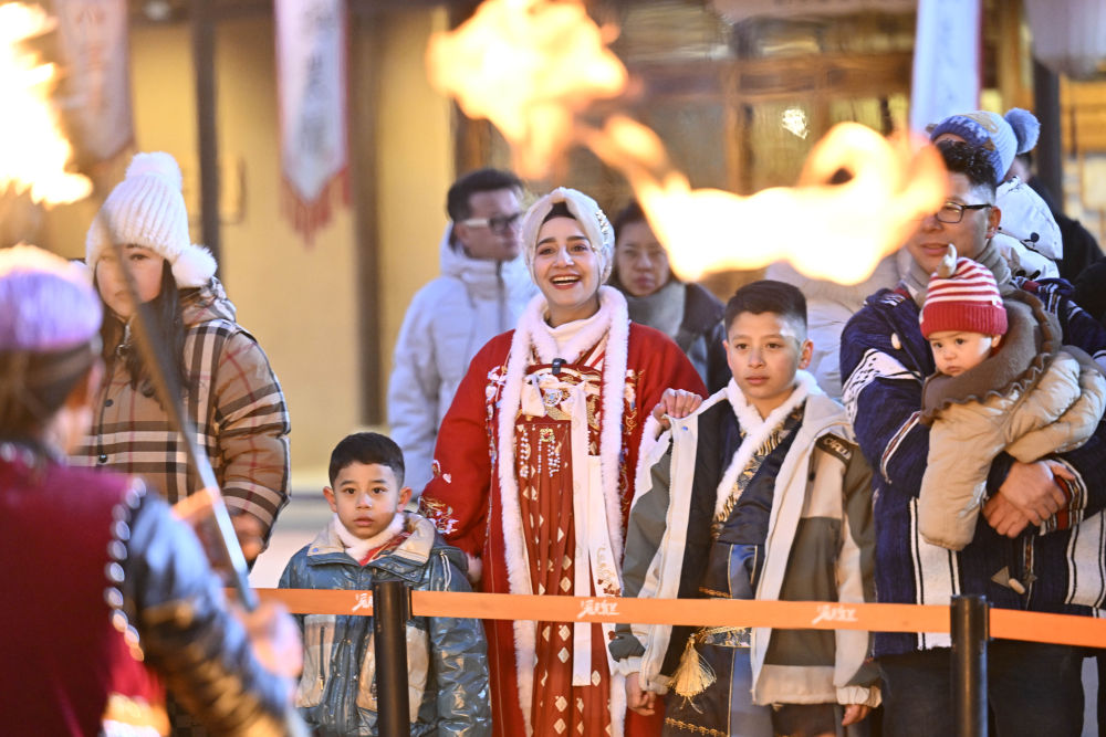 1月14日,外國友人在銀川市漫葡小鎮(zhèn)觀看演出。 新華社記者 王鵬 攝