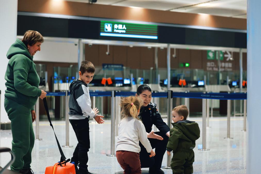 俄羅斯瑪莎一家,申請了臨時入境許可,在北京中轉。看到一行有三個孩子,孫麗靜主動上前服務,為孩子們倒上溫水解渴,陪他們玩耍。