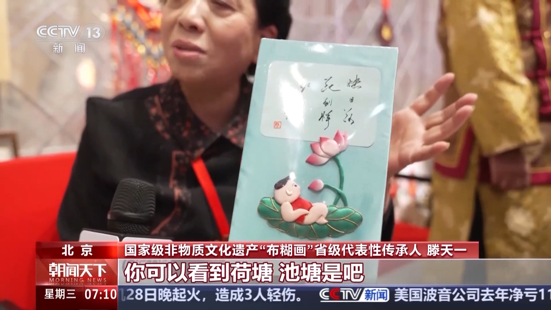 北京國家級非物質(zhì)文化遺產(chǎn)“布糊畫”省級代表性傳承人 滕天一:很多手工掛件做完了到不了一分鐘就買走了。從古到今幾千年了,我們中國的東西到哪兒你細(xì)看,它是有內(nèi)涵的東西。比如說我拿了楊萬里的一句詩“映日荷花別樣紅”你可以看到荷塘、池塘是吧,再想到我們的詩、詩人,它都是有意境的。