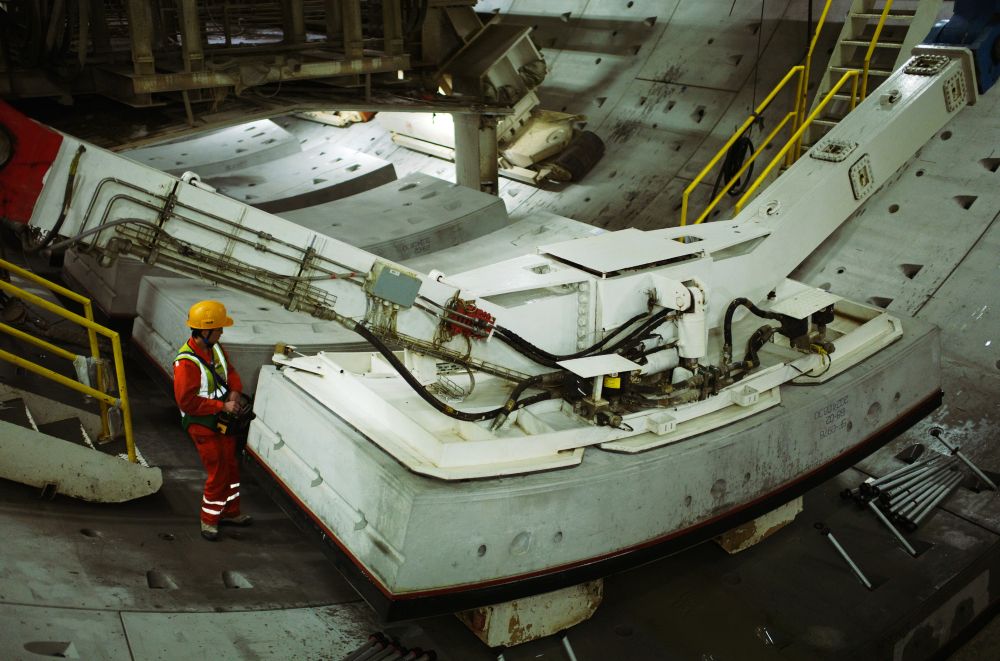 點點“星光”盡頭,拼裝班長周洪強(qiáng)操作伸縮機(jī),將一塊隧道管片緩緩抓起。穩(wěn)穩(wěn)平移、旋轉(zhuǎn)過后,12噸重的管片精準(zhǔn)落位。