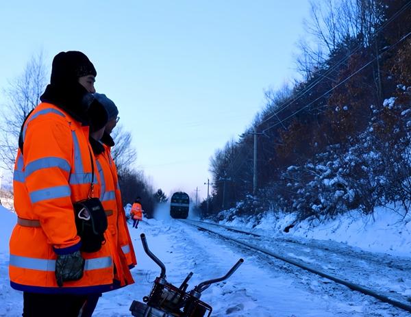 2月2日,小興安嶺,綏化工務(wù)段伊春二工隊班長田立鋒帶領(lǐng)6名青工對線路進行整修后,一輛滿載貨物的列車通過。吳健/攝