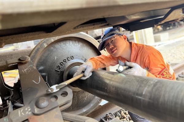 1時30分,作業(yè)人員攜帶道尺、檢查錘、油壺等材料工具,向站場西邊進發(fā),點點頭燈猶如點點螢光,緩緩向前方移動。10分鐘后,左自強抵達14號道岔,他彎下腰,將道尺卡在鋼軌間讀取數(shù)值?!?.5、0.4、0.5……”他邊檢查邊記錄,不放過一處問題隱患。在一顆松動螺栓處,左自強先用手旋緊,再用扳手緊固,最后雙手用力下壓扳手,直至螺栓紋絲不動。“一顆螺栓松動,就可能帶來重大安全隱患。再細小的事情我們也要認真仔細地做好?!弊笞詮娬f。