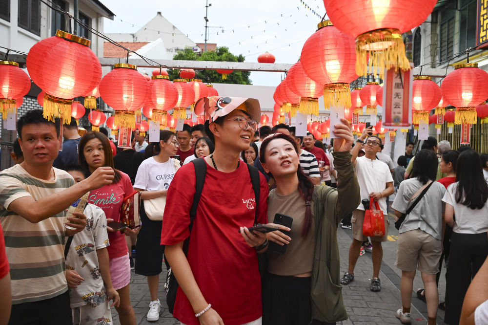 2月1日,人們?cè)隈R來(lái)西亞檳城廟會(huì)上參與猜燈謎活動(dòng)。新華社發(fā)(李奕慧攝)