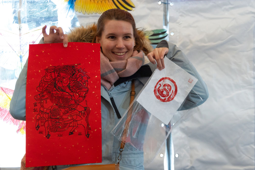 1月18日,一名女子在匈牙利首都布達(dá)佩斯舉行的新春廟會(huì)活動(dòng)上手持木版年畫留影。新華社發(fā)(弗爾季·奧蒂洛攝)