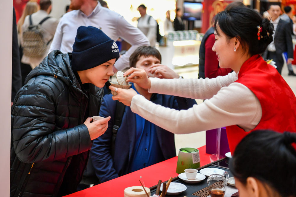 1月28日,在俄羅斯莫斯科舉行的新春廟會(huì)活動(dòng)上,游客在感受茶文化。新華社記者曹陽(yáng)攝