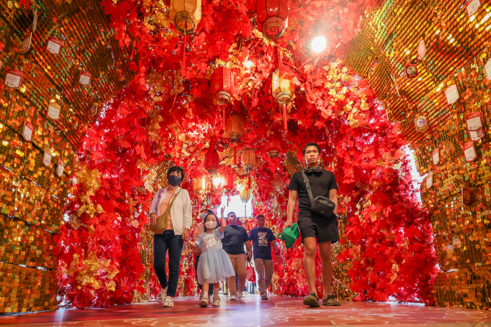 1月27日,在菲律賓馬尼拉,人們穿過(guò)掛滿春節(jié)裝飾的走廊。新華社發(fā)(烏馬利攝)