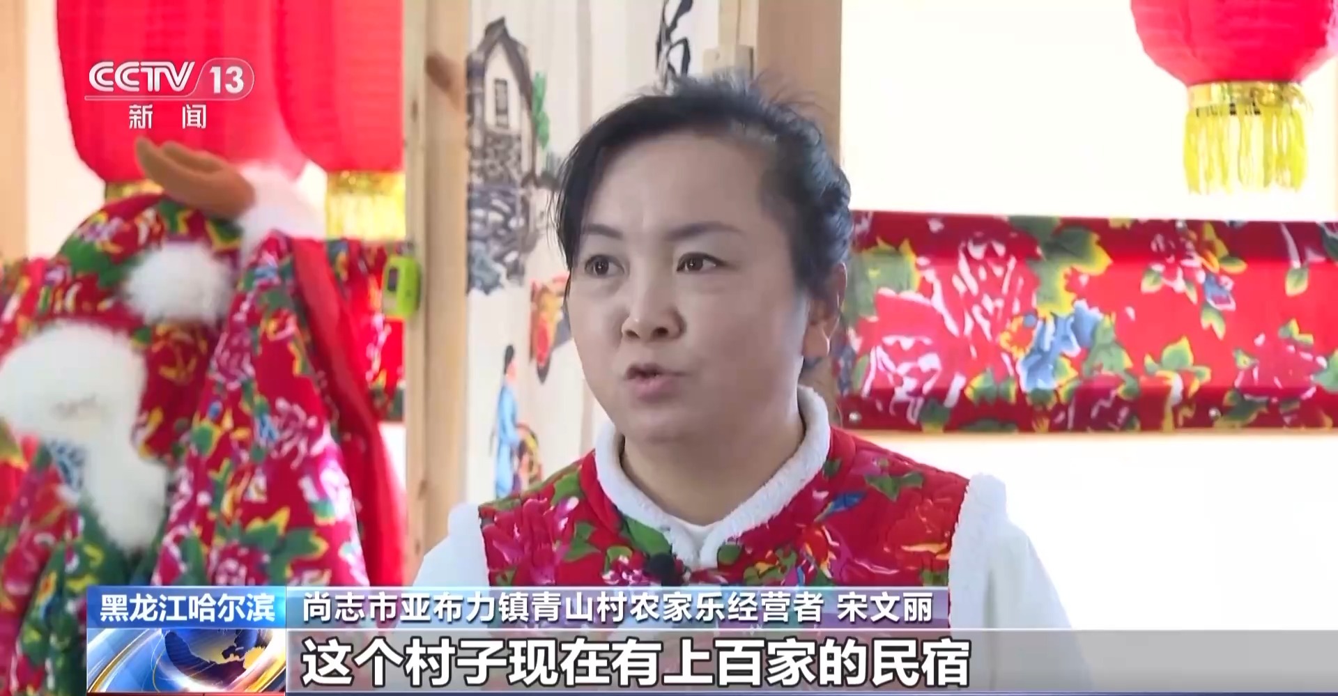 總臺記者 王海樵:現(xiàn)在一走進(jìn)村子就可以隨處看到這種掛著大紅燈籠的農(nóng)家樂和民宿,全村有300多戶人家,其中有120多戶都是從事和滑雪旅游產(chǎn)業(yè)相關(guān)的生意,如今的青山村也成為了名副其實(shí)的亞布力山下第一村。