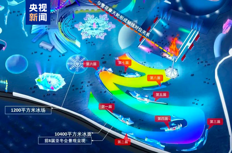 崔師堯介紹,“整個冰面有一個方向性色彩的律動,配合冰道兩邊往屆亞冬會的元素,讓人仿佛進入了一個流光溢彩的時光隧道。”歷史與當代、過去與現(xiàn)在、小朋友與冠軍火炬手,在這一刻仿佛看到了傳承和發(fā)展。