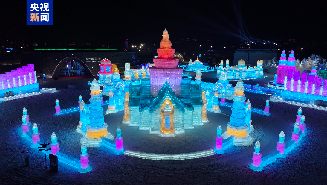 傍晚來臨,落日余暉中,一座座冰雕被點亮。夜幕降臨后,冰雕建筑群又迎來一場華麗轉變。