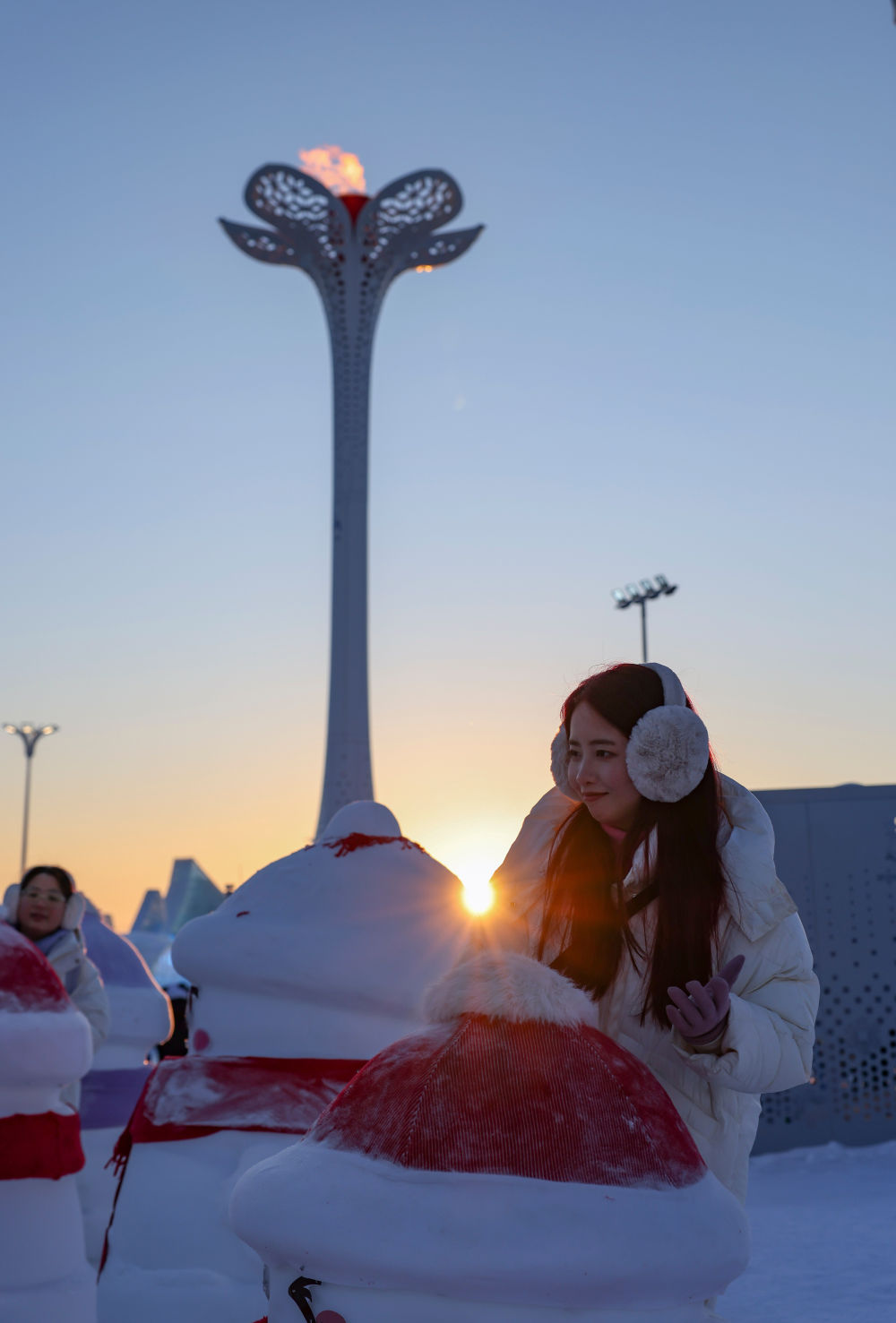 2月8日,游客在哈爾濱冰雪大世界游玩,遠處是亞冬會主火炬。新華社記者 胡星宇 攝