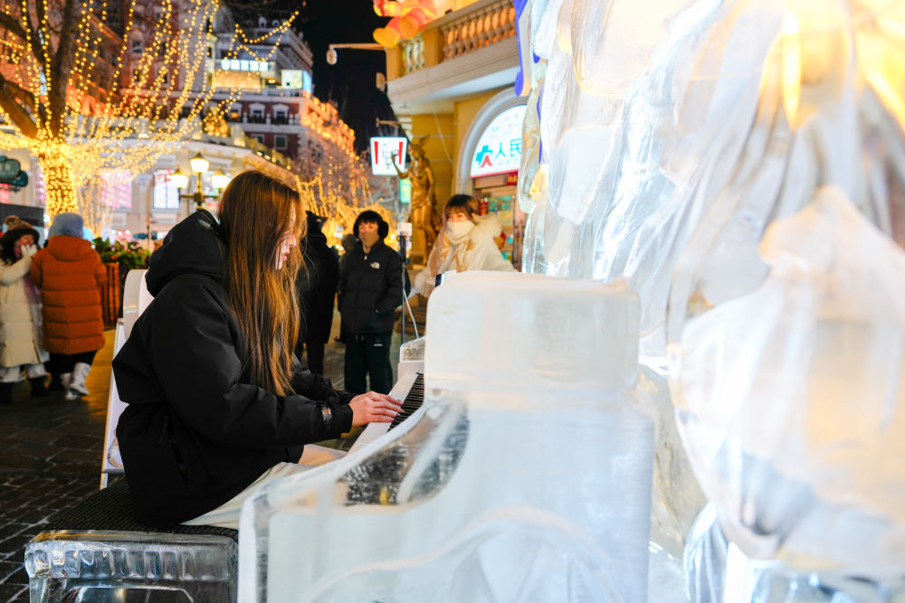 1月30日,游客在哈爾濱中央大街上彈奏冰鋼琴。新華社記者 王建威 攝