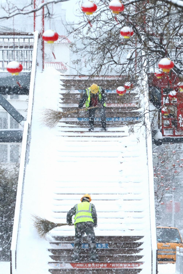 2025年1月28日,在山東省威海市環(huán)翠區(qū),市政工人冒雪清掃過(guò)街天橋積雪。新華社發(fā)(劉中華 攝)