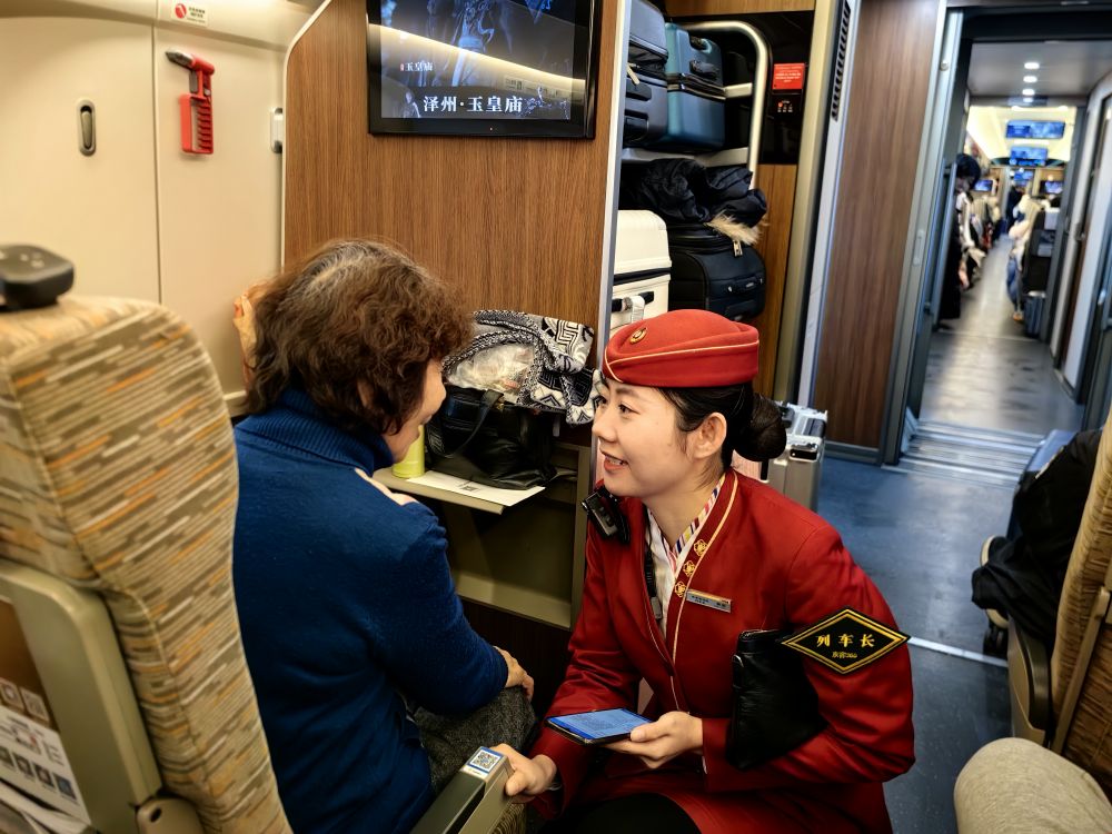 2025年1月25日,在北京開(kāi)往上海的G9次列車(chē)上,列車(chē)長(zhǎng)韓茹為一位獨(dú)自出行的老年旅客服務(wù)。新華社記者 翟翔 攝