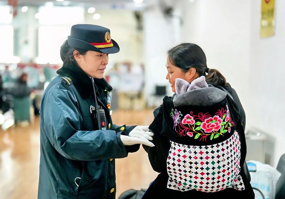2025年1月29日,國(guó)鐵武漢局襄陽(yáng)站客運(yùn)員穆佟在為旅客服務(wù)。新華社發(fā)(劉娟 攝)