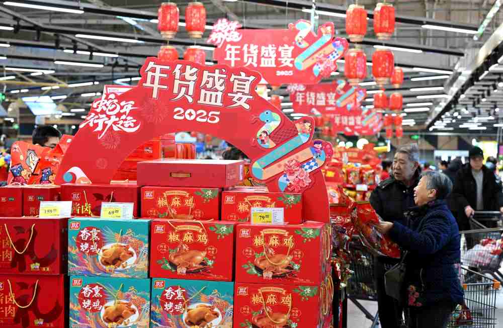 2025年1月24日,顧客在河北省石家莊市新華區(qū)北國(guó)超市中環(huán)店選購(gòu)年貨。新華社發(fā)(陳其保 攝)