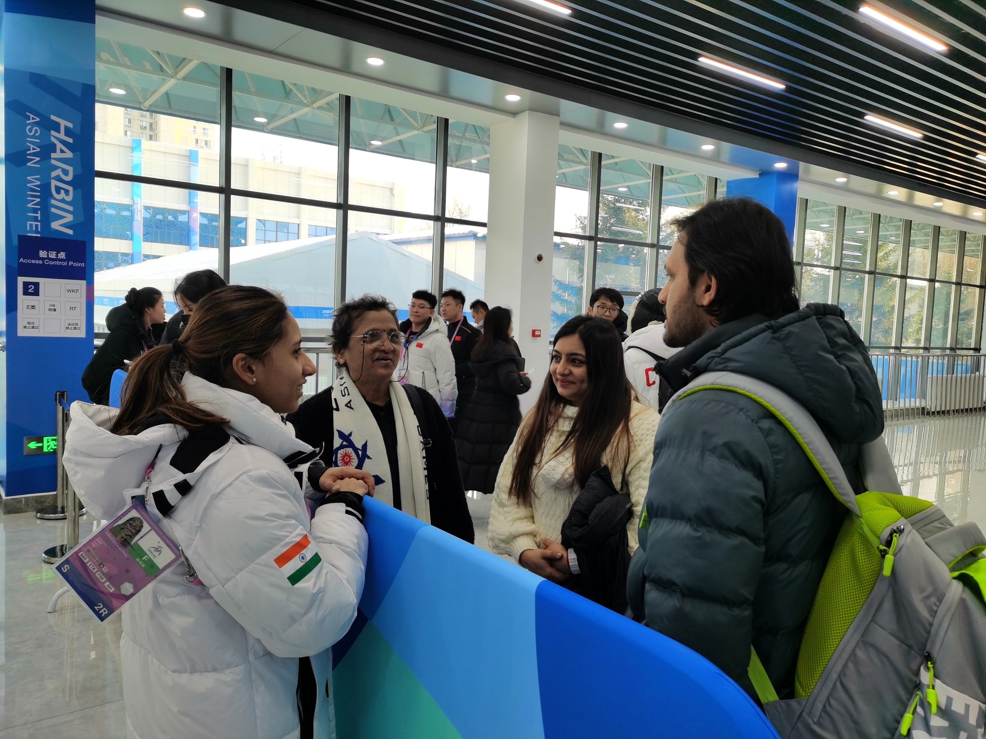 印度速度滑冰選手詩魯?shù)俚募胰?,也選擇這次亞冬會的機會,來到哈爾濱與她團聚。詩魯?shù)俚慕憬惆涂说俑嬖V記者,印度的滑冰訓練條件有限,為了追逐夢想,妹妹常年在美國訓練,一家人難得有機會聚在一起。