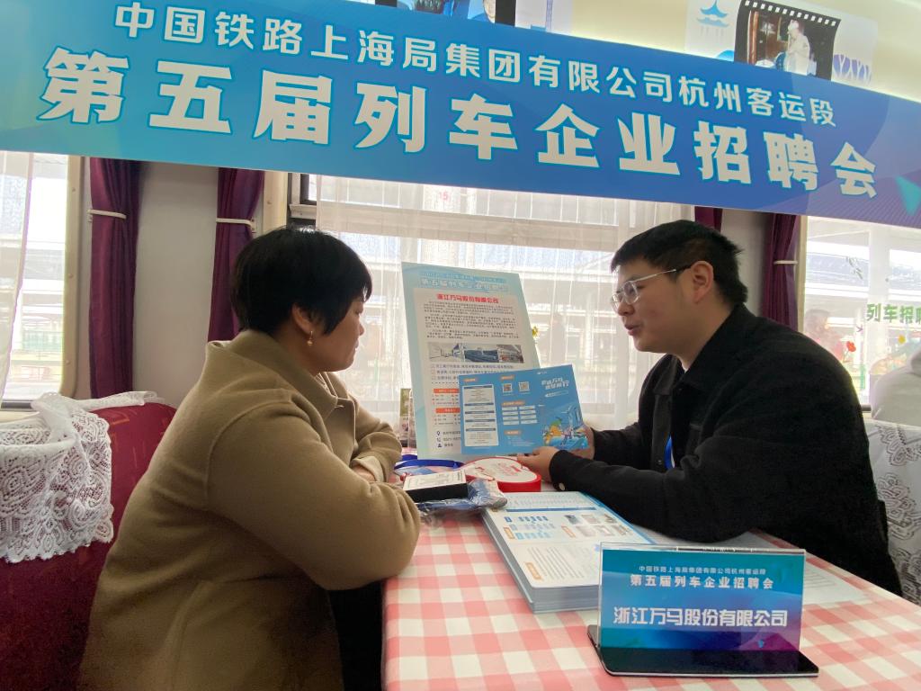 杭州客運(yùn)段甬廣車(chē)隊(duì)黨總支書(shū)記朱秦予介紹,當(dāng)天除了在K210次列車(chē)設(shè)置企業(yè)一對(duì)一招聘臺(tái),列車(chē)工作人員還通過(guò)網(wǎng)絡(luò)直播,在西安開(kāi)往寧波的K468次、蘭州開(kāi)往杭州的T114次等列車(chē)上同步開(kāi)展線上招聘會(huì),為更多旅客提供崗位選擇。