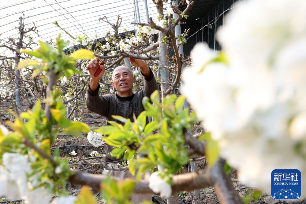 2月18日,在山東省濱州市博興縣呂藝鎮(zhèn)高渡村,農(nóng)民在管護櫻桃樹。