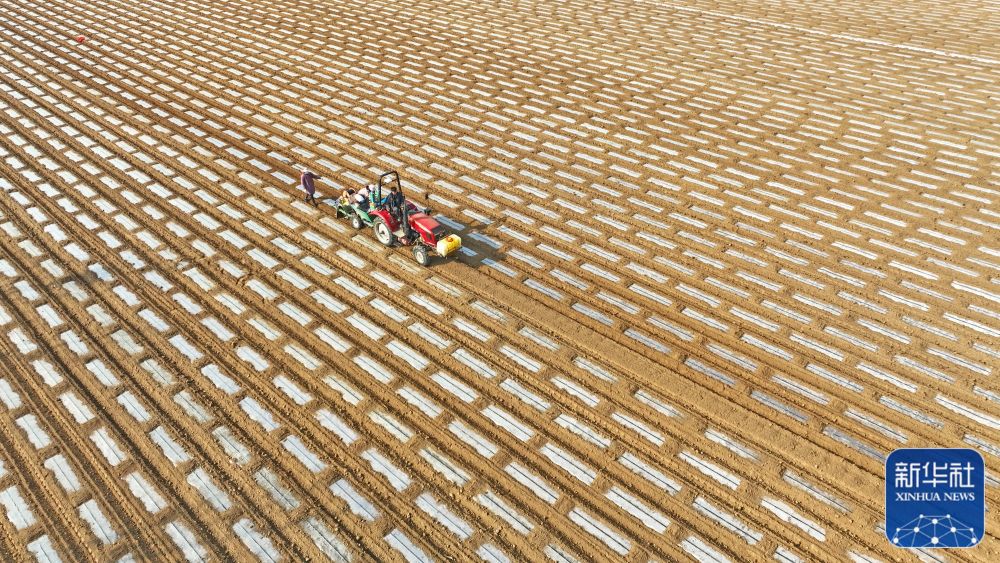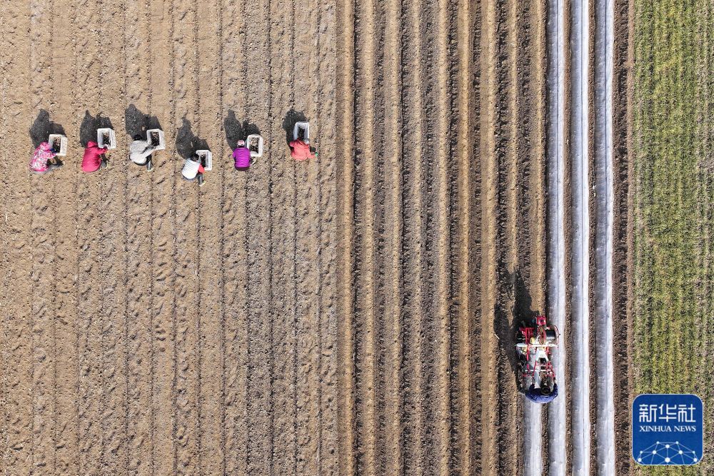2月18日,在山東省臨沂市郯城縣郯城街道一處蔬菜種植基地,農(nóng)民使用農(nóng)機播種“訂單土豆”(無人機照片)。