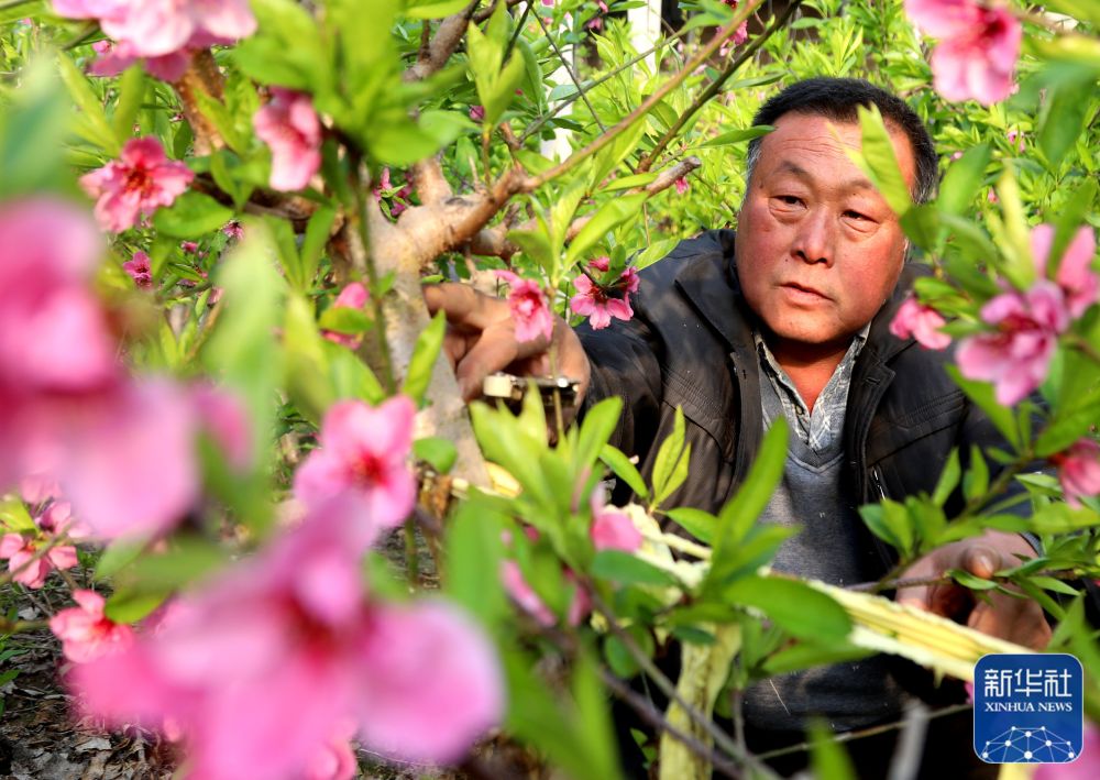 2月18日,在河北省滄州市吳橋縣于集鎮(zhèn)孫莊村,農(nóng)民在給油蟠桃樹剪枝。