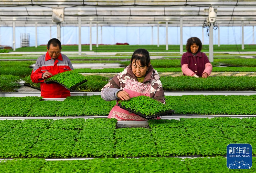 2月18日,在浙江省寧波市鎮(zhèn)海區(qū)九龍湖鎮(zhèn)種苗培育基地,工作人員在管護菜苗。