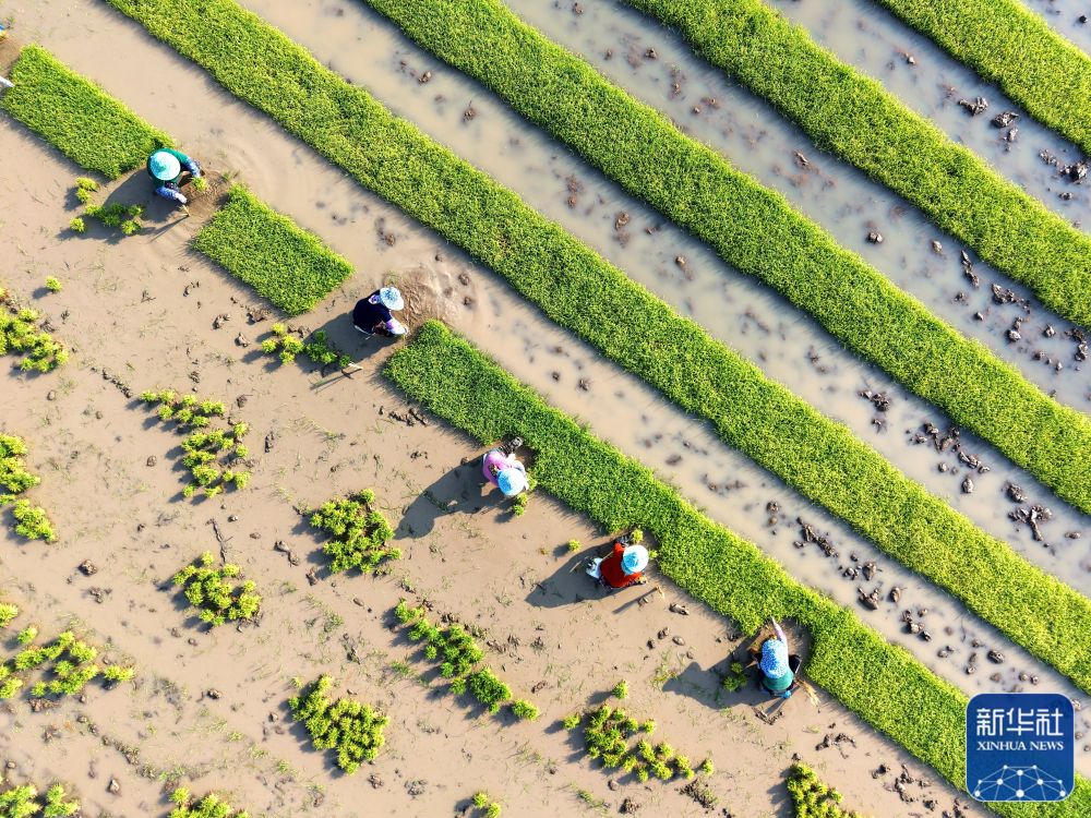 2月18日,在云南省西雙版納州勐海縣勐遮鎮(zhèn)曼拉村,農(nóng)民在田間起秧(無人機照片)。