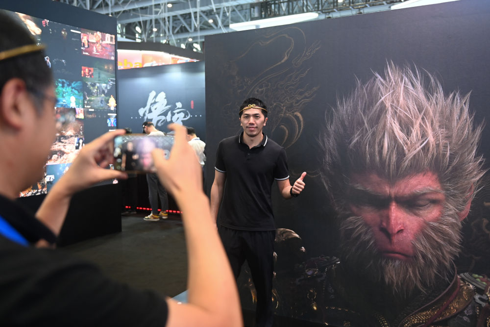 2024年9月25日,觀眾在第三屆全球數(shù)字貿(mào)易博覽會的游戲科學(xué)展區(qū)打卡。新華社記者 黃宗治 攝