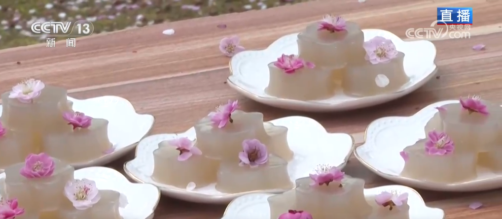 這個季節(jié)來到芳院村,與賞花踏青最搭配的就是圍爐煮茶了。芳院村的茶也非常特別,叫做“蛋茶”。就把煮開的茶水沖入均勻攪拌的蛋液中,然后再加上冰糖,這就是“蛋茶”。每當村里誰家辦大事、干重活的時候,村民們都會泡蛋茶來接待,這也是當地的待客首禮。在芳院村,這個季節(jié)還有一個春日限定美食,就是梅花糕。它主要的原材料是當地的地瓜粉,關鍵在于用了梅花花瓣熬出來的汁。梅花糕不僅形似梅花,而且入口甜糯、味道清雅,這些也是芳院村正在打造的“花樣”經濟。近年來,當地在保護傳統(tǒng)村落的基礎上,以花為“媒”培育“花樣”經濟,吸引游客前來賞花打卡,帶動村集體和村民雙增收。