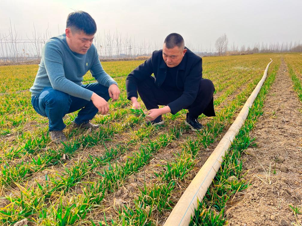 山東省嘉祥縣金屯鎮(zhèn)賀李胡村種糧大戶張春杰(左一)正在和村干部一同查看麥苗長勢。(受訪對(duì)象供圖)